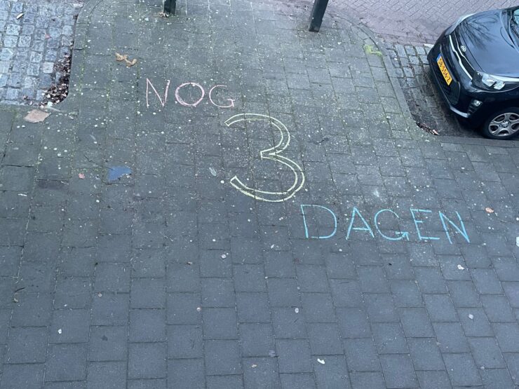 Hoewel de sfeeractie pas vrijdagochtend plaatsvindt, is de voorpret hier en daar al zichtbaar. Op verschillende straten en stoepen wordt de afgelopen dagen al afgeteld met stoepkrijt: “Nog 4 dagen”, “Nog 3 dagen”…